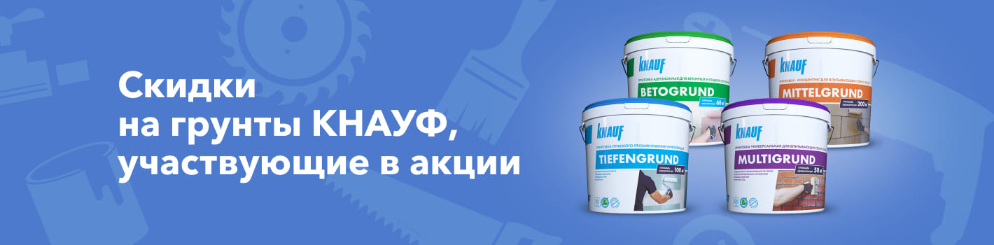 Скидки на грунты КНАУФ: КНАУФ Бетогрунд, 15 кг, КНАУФ Миттельгрунд, 10 кг, КНАУФ Мультигрунд, 10 кг и КНАУФ Тифенгрунд, 10 кг.
