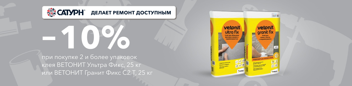 При единовременной покупке 2 и более упаковок клея ВЕТОНИТ Ультра Фикс, 25 кг или ВЕТОНИТ Гранит Фикс С2 Т, 25 кг, Вы получаете скидку 10%