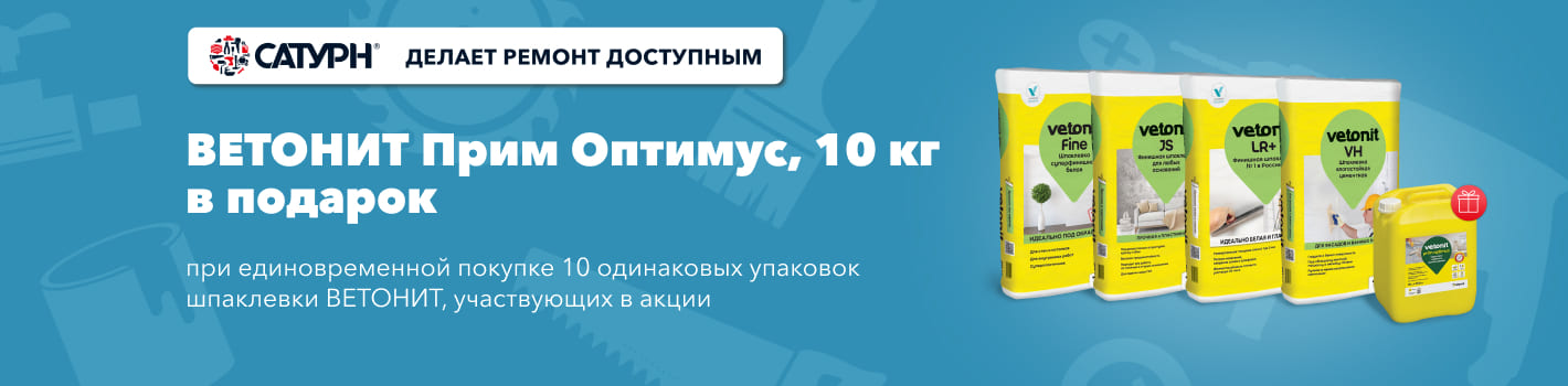 При единовременной покупке 10 одинаковых упаковок шпаклевки ВЕТОНИТ ЛР+ (20 кг) или ВЕТОНИТ ВХ (20 кг) или ВЕТОНИТ Файн (20 кг) или ВЕТОНИТ Джэй Эс (20 кг) клиент получает 1 упаковку грунтовки ВЕТОНИТ Прим Оптимус (10 кг) в подарок