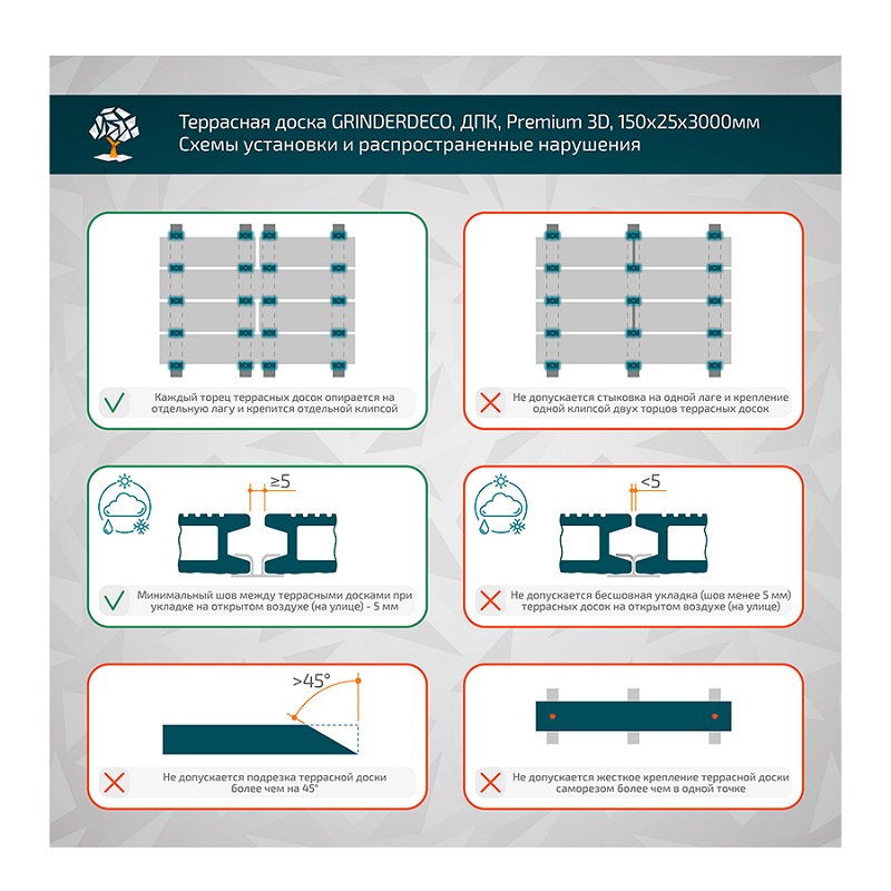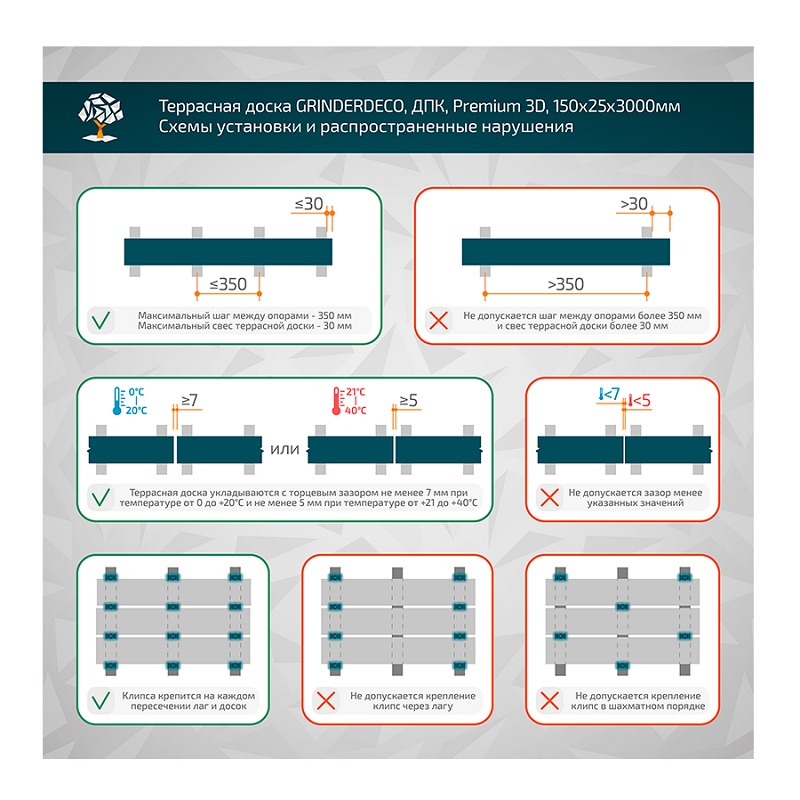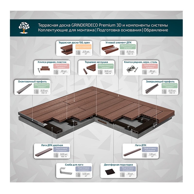 На 1 м2 с учетом шва рядных клипс в 5 мм требуется 2,15 шт террасных досок 150х25х3000 мм.