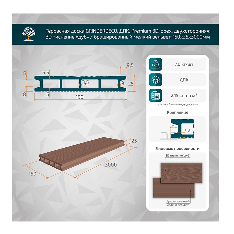 Доска террасная Grinderdeco, ДКП, 25х150х3000 мм, орех, брашированный мелкий вельвет