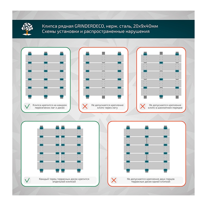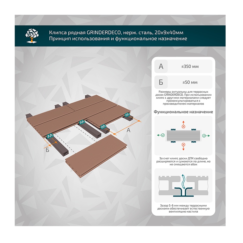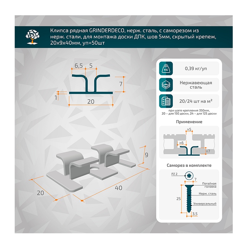 Клипса рядная Grinderdeco, с саморезом, шов 5 мм, 20х9х40 мм (50 шт.)