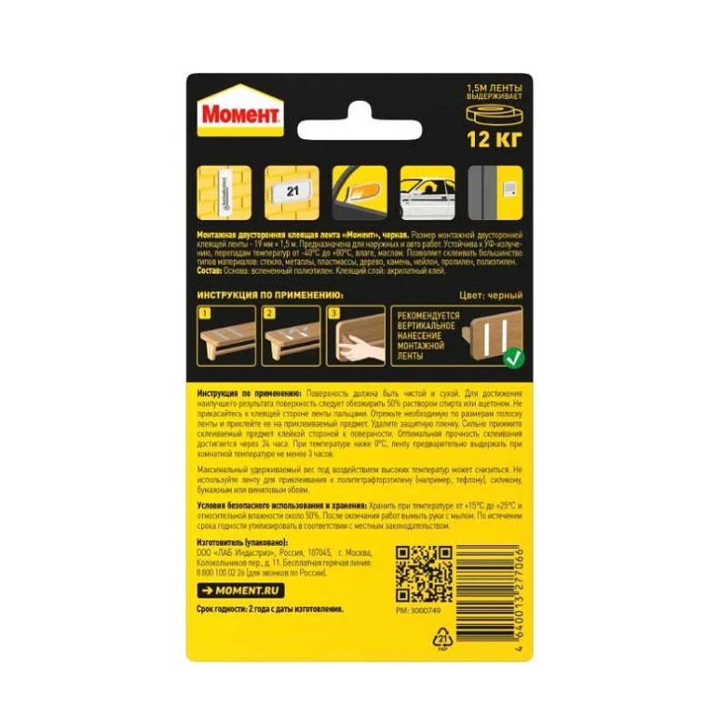 В строительном магазине Сатурн можно купить товар "Лента клеящая монтажная двусторонняя Момент, черная (1,5 м)" по цене от 283 руб с доставкой за 2 часа по Санкт-Петербургу или оформить самовывоз.