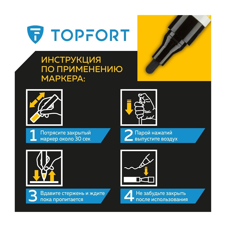 - Снимите колпачок, прижмите наконечник к поверхности, надавите до упора и удерживайте пока не проступит краска.